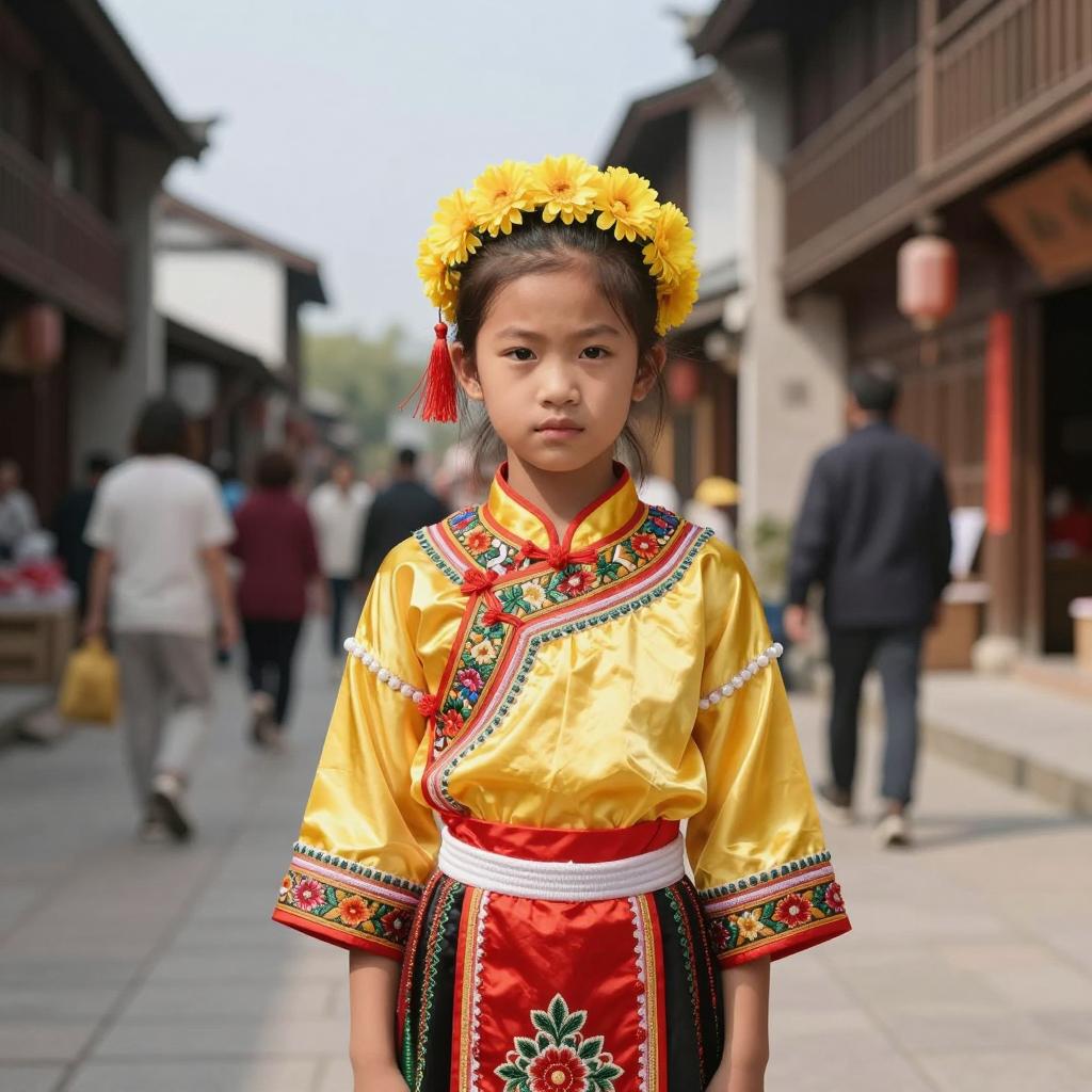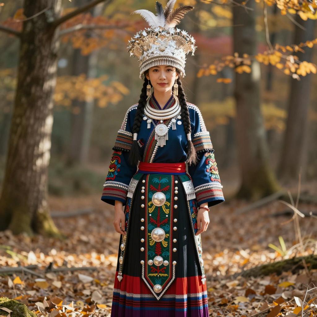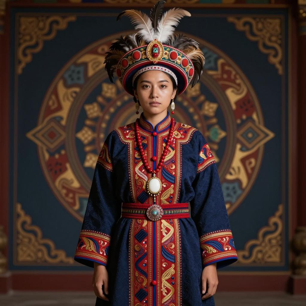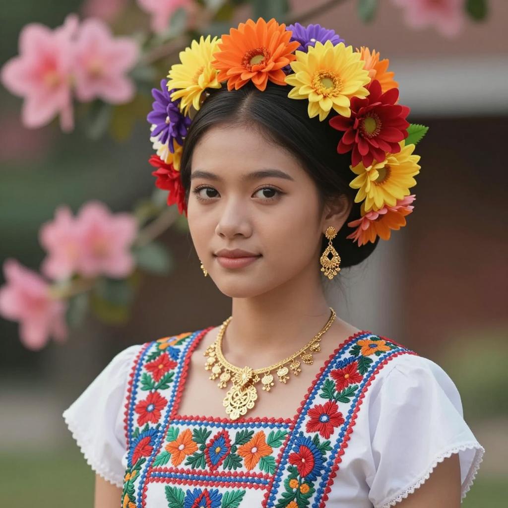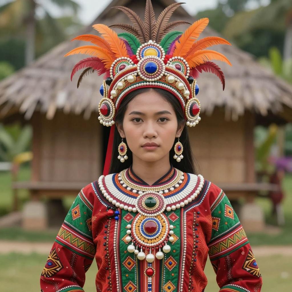 Masskara festival costume, photograph of an Asian woman wearing traditional indigenous attire, teal dress with red and gold embroidery, large feathered headdress with red and orange feathers, detailed necklace and earrings, brown leather belt, standing in a sunny street, blurred background with people and trees, realistic, high detail, natural light, confident expression, cultural festival or ceremony, traditional dress, portrait shot