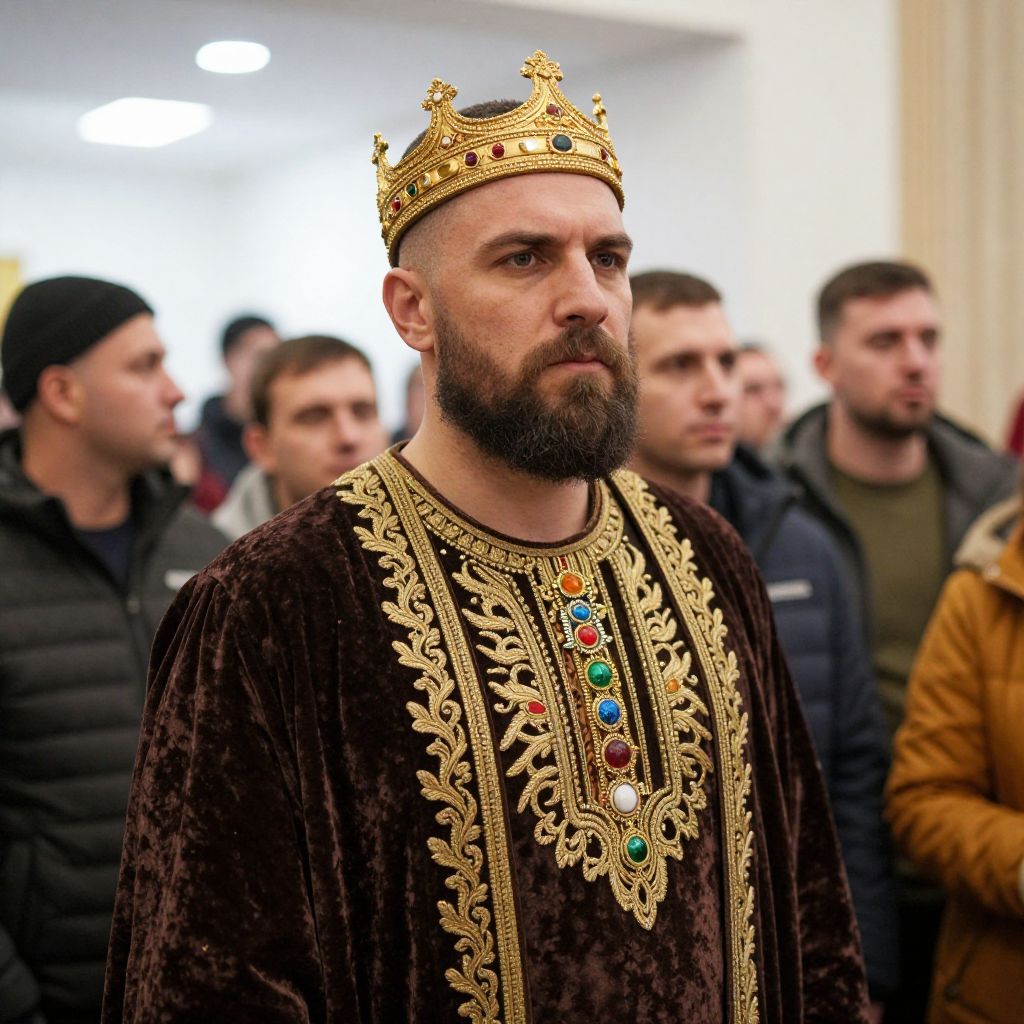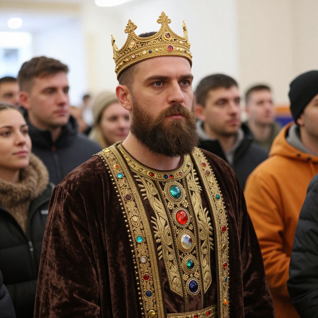 Photograph of a bearded man with a serious expression, wearing an elaborate gold crown and a richly embroidered brown velvet robe with gold patterns and colorful gems on the chest. He stands in a slightly blurred crowd of people, most of whom are dressed in casual winter clothing. The background is an indoor setting with bright lights.