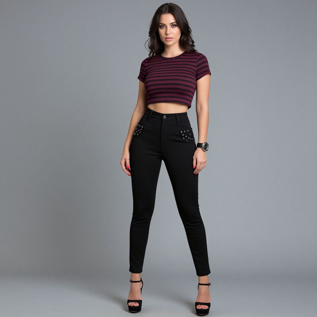 Photograph of a young woman with long, wavy dark brown hair and fair skin, standing against a plain gray background. She wears a short-sleeved, cropped maroon and black striped top, exposing her midriff, paired with high-waisted, black skinny jeans that have silver studs on the front pockets. She completes her outfit with black high-heeled sandals and a black wristwatch on her left wrist. She has a confident, slightly serious expression and stands with her arms relaxed by her sides. The lighting is even, highlighting her casual, stylish look.