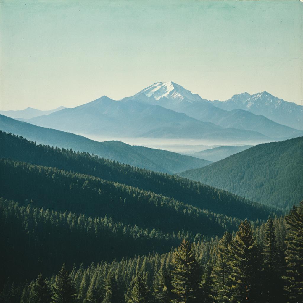 Soft, misty landscape featuring a dense forest of evergreen trees set against a backdrop of majestic snow-capped mountains. The image blends muted greens, blues, and browns to create a tranquil atmosphere with layered contours of mountain ridges fading into the distance.