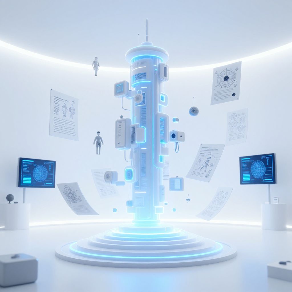 Futuristic concept art ideas generator imagined as a towering AI interface projecting endless creative concepts, surrounded by floating 3D models and sketches, set in a minimalist white studio with ambient blue lighting and digital screens, sci-fi aesthetics