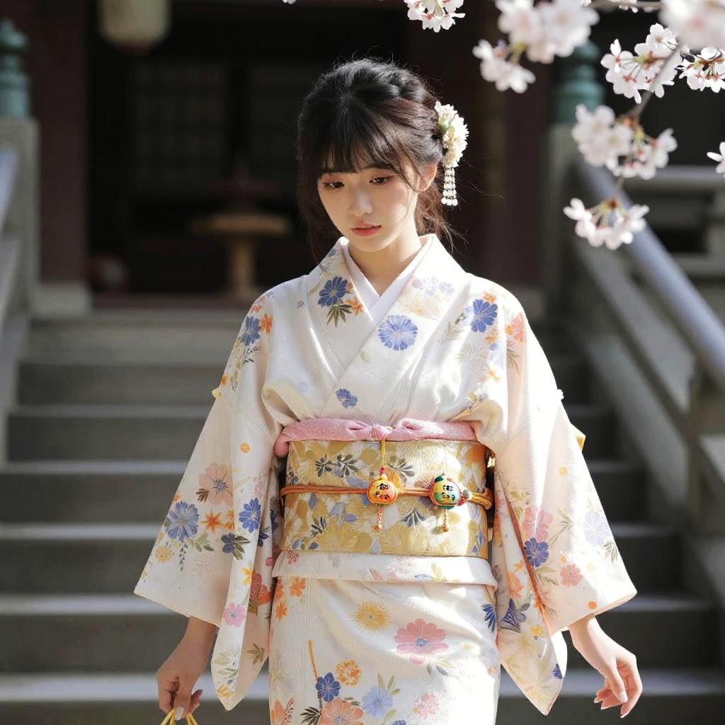 (masterpiece:1.2), photorealistic, best quality, beautiful lighting, real life, 1girl, natural makeup, walking on stairs, shire, temple, flowers, bamboo, flowerly yukata, lucky charm, traditional hair ornament, spring, ultra detailed face, ultra detailed eyes, perfect fingers, perfect nails, intricate, high detail, sharp focus, dramatic, beautiful girl, (RAW photo, 8k uhd, film grain), caustics, subsurface scattering, reflections