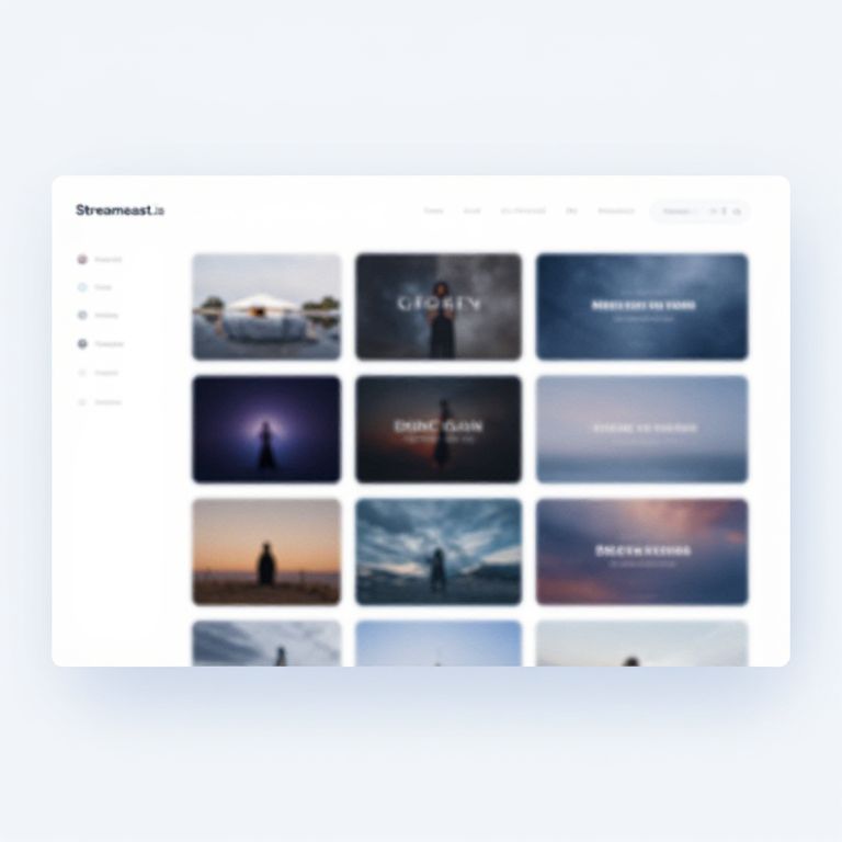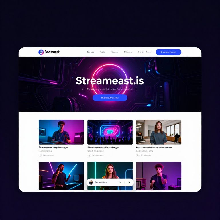 Streameast.is vibrant streaming website homepage, futuristic UI design with bright neon accents, dynamic video thumbnails, engaging user interface elements, sleek navigation bar, modern tech theme, high contrast colors, digital art style