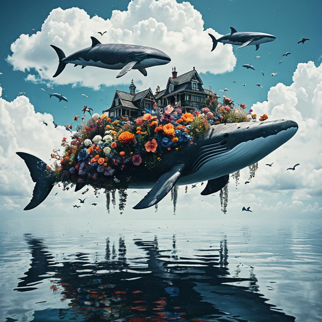 Digital art depicting a floating island adorned with vibrant flowers and a vintage wooden house. The scene includes sky whales swimming through clouds and a variety of birds flying around the island. The island hovers above a calm sea under a partly cloudy sky.