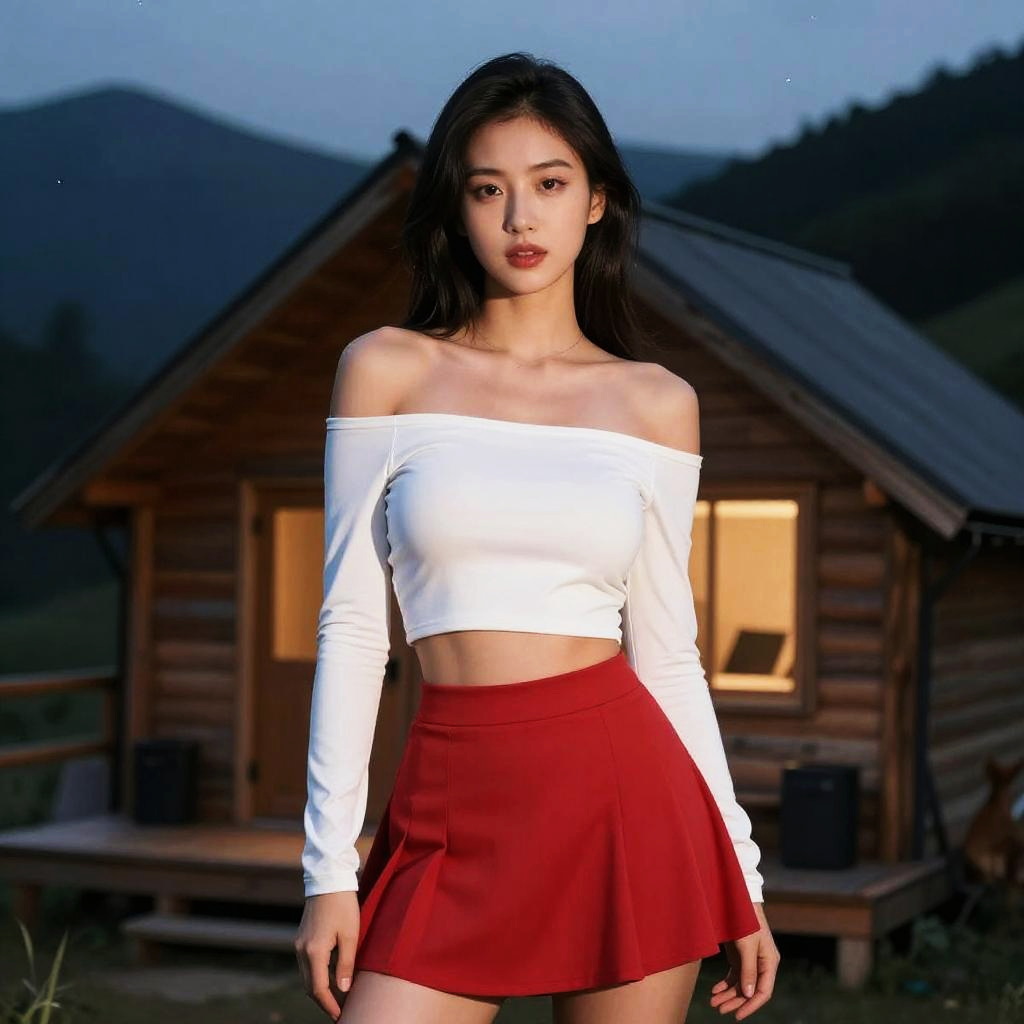 Photograph of an East Asian woman with long black hair standing in front of a wooden cabin at dusk. She has a fair complexion and is wearing a white, off-the-shoulder, long-sleeve crop top and a short, red skirt. Her expression is neutral, with slightly parted red lips. The cabin has a dark wooden exterior, illuminated windows, and is set against a mountainous background with a twilight sky. The scene is illuminated by soft, natural light, highlighting her outfit and the cabin's warm interior glow.