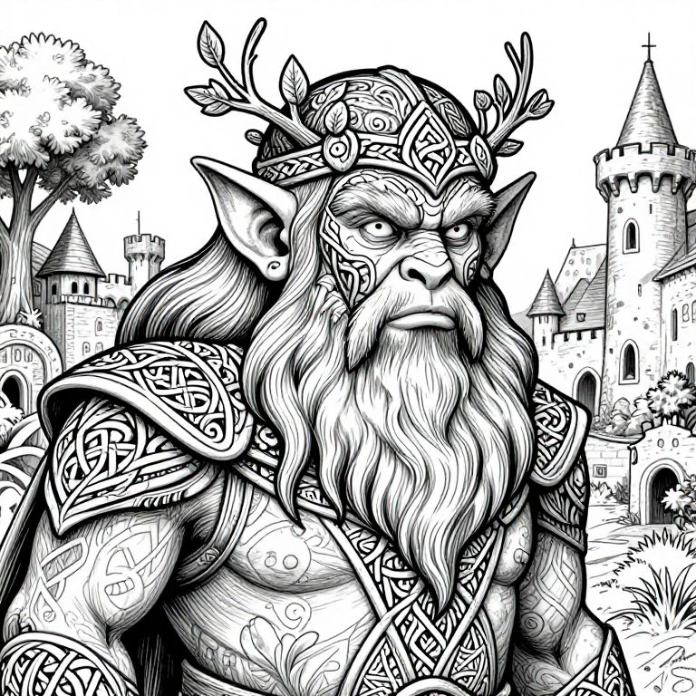 The image depicts a highly detailed and intricately designed troll, rendered in a black and white coloring book style. The troll, which occupies the majority of the frame, is adorned with elaborate Celtic-inspired patterns and textures, giving it a medieval and nature-inspired aesthetic. Its face is covered with intricate designs, including a crown-like headpiece with branches and leaves, adding to its mystical and ancient appearance. The troll's beard and hair are long and flowing, blending seamlessly with the surrounding environment. In the background, medieval houses with detailed architecture and nature elements, such as trees and foliage, create a harmonious blend of the natural and built worlds. The overall composition is dynamic, with the troll positioned centrally, drawing the viewer's eye through the scene. The image is rich in detail, with a focus on the troll's intricate designs and the interplay between the troll and its environment, creating a sense of depth and complexity.