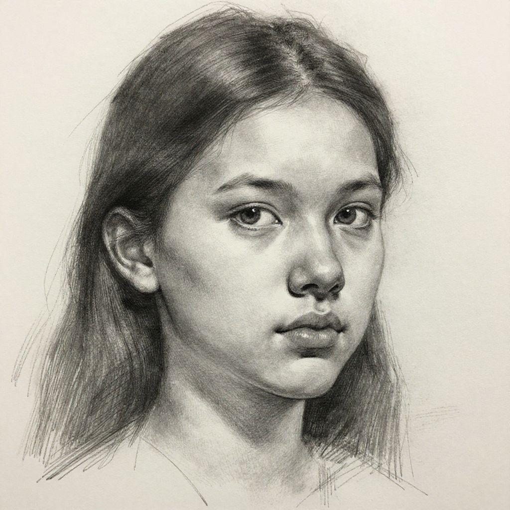 Face drawing realistic monochrome sketch of a young woman, blending graphite and charcoal techniques to emphasize facial structure, hair strands detailed with precision, soft ambient shadows adding depth and tactile texture, evoking a classical art feel.