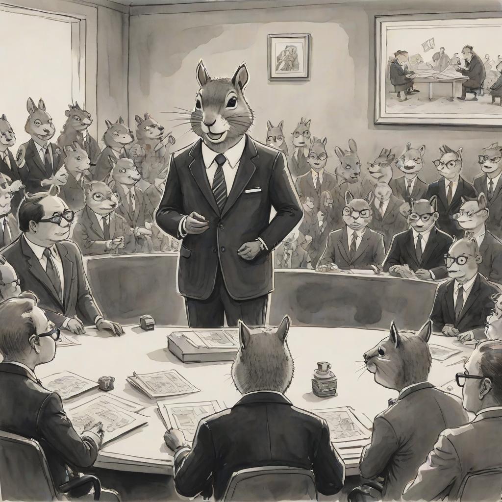 A single-panel ink and wash cartoon in the style of The New Yorker, depicting a squirrel in a business suit giving a presentation to a group of other animals, whimsical and humorous tone, highly detailed