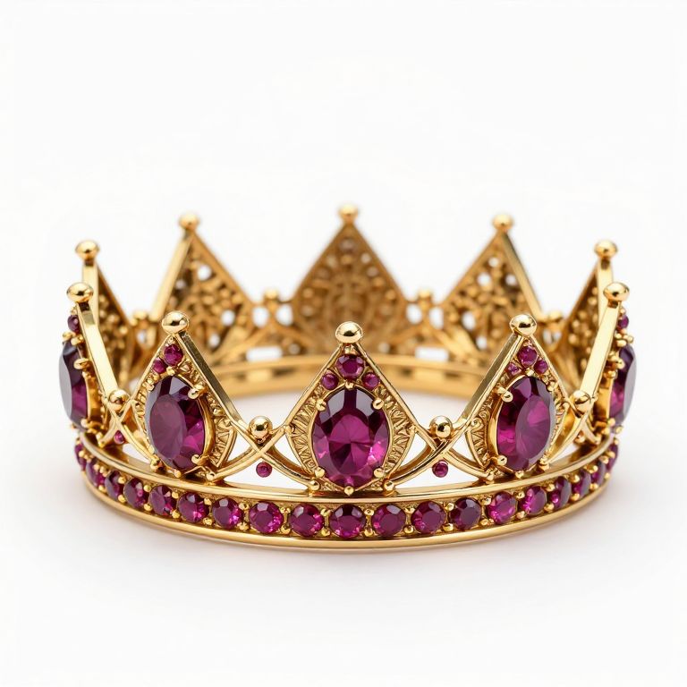 Photograph of an ornate, gold crown adorned with large, teardrop-shaped, deep purple gemstones at each point, and smaller, round purple gemstones encircling the base. The crown has a delicate, lattice-like pattern between the gemstones, adding intricate detail. The gold metal has a polished, shiny finish, contrasting with the rich, vibrant purple of the gemstones. The background is a plain, white, solid color, making the crown the focal point. The image highlights the crown's luxurious and regal design.