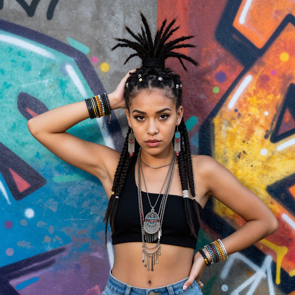 Young woman with brotherlocks styled up into an artistic crown, bold and confident pose, vibrant graffiti wall behind, high contrast lighting, contemporary fashion mixed with tribal jewelry, energetic urban vibe, emphasizing empowerment and culture.