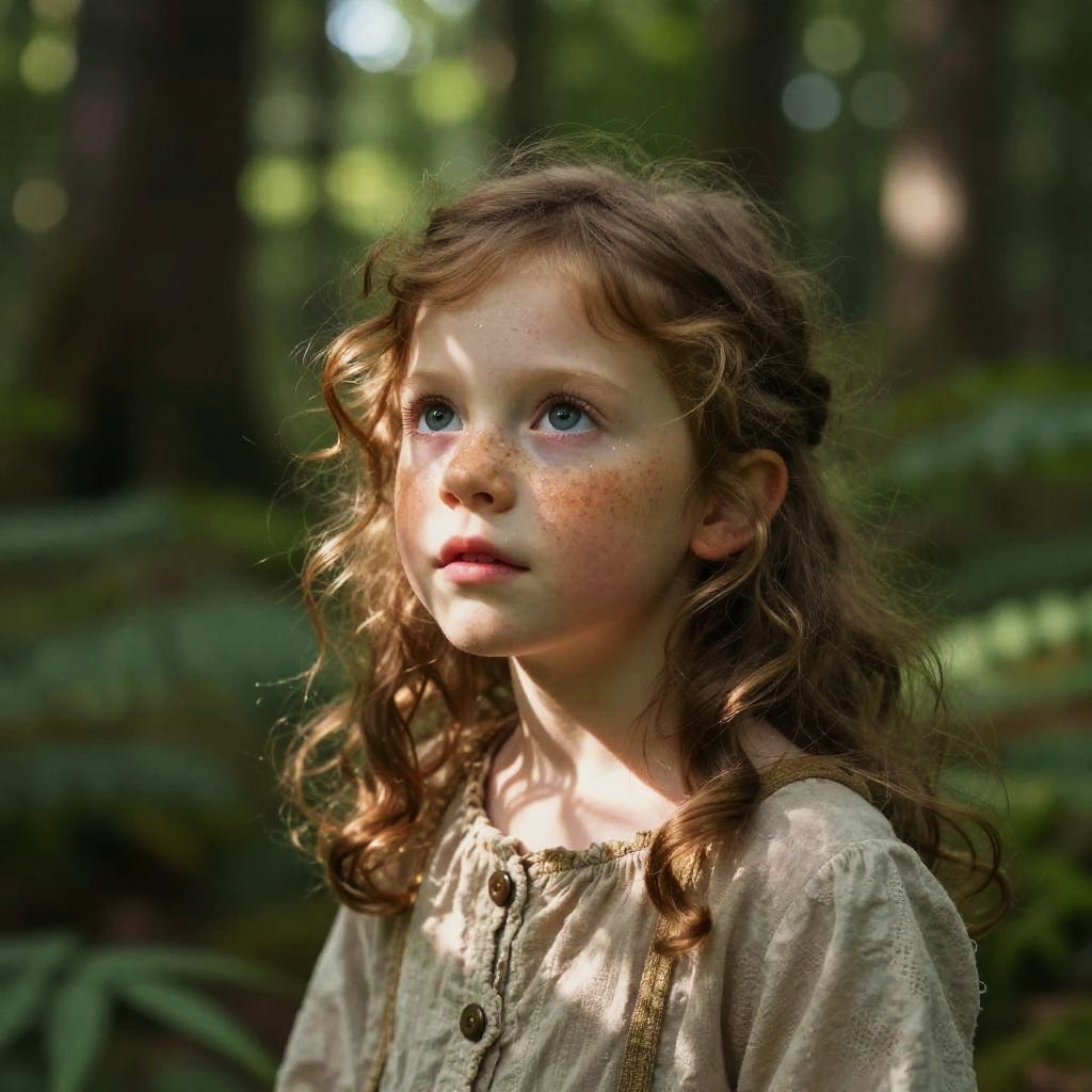 Portrait of a little girl freckles sparkling under dappled sunlight in an enchanted forest, her curly hair tousled by the breeze, wearing rustic clothes, expressive eyes full of wonder and innocence, soft focus background filled with lush green foliage.