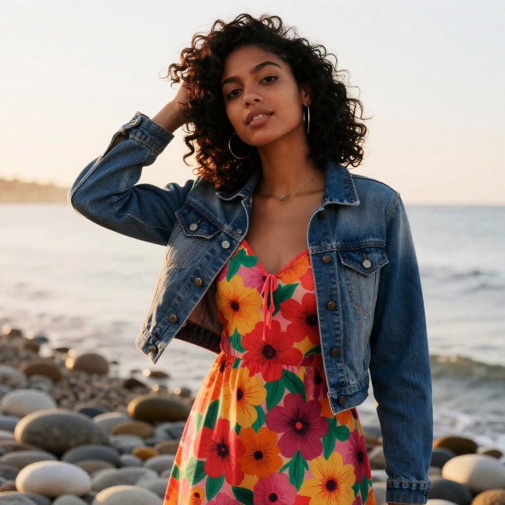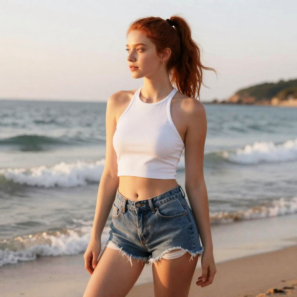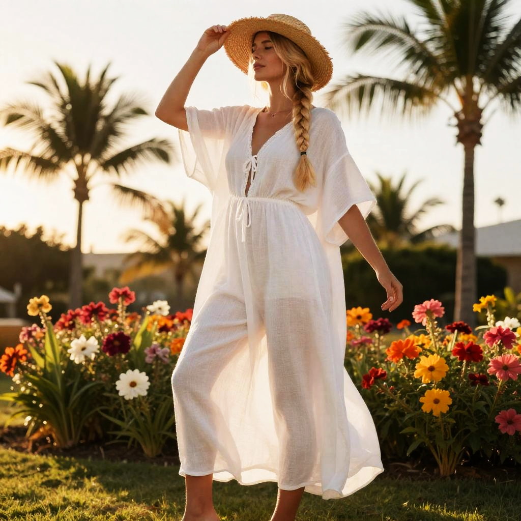 Tall blonde woman with braided crown wearing flowy white linen kaftan and straw sun hat, posed in tropical garden with colorful flowers and palm trees under golden hour backlit glow, fun summer snapshot-style beachwear photography, high resolution, ultra-detailed