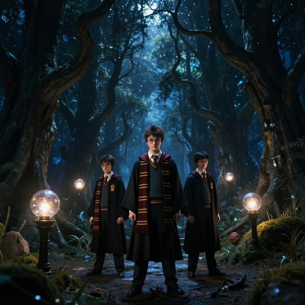Three young men dressed as Harry Potter characters stand in a dark, enchanted forest at night. They wear Gryffindor robes and scarves, surrounded by glowing magical orbs that illuminate the ancient twisted trees and mysterious shadows under a starry sky. The scene has a cinematic fantasy atmosphere.