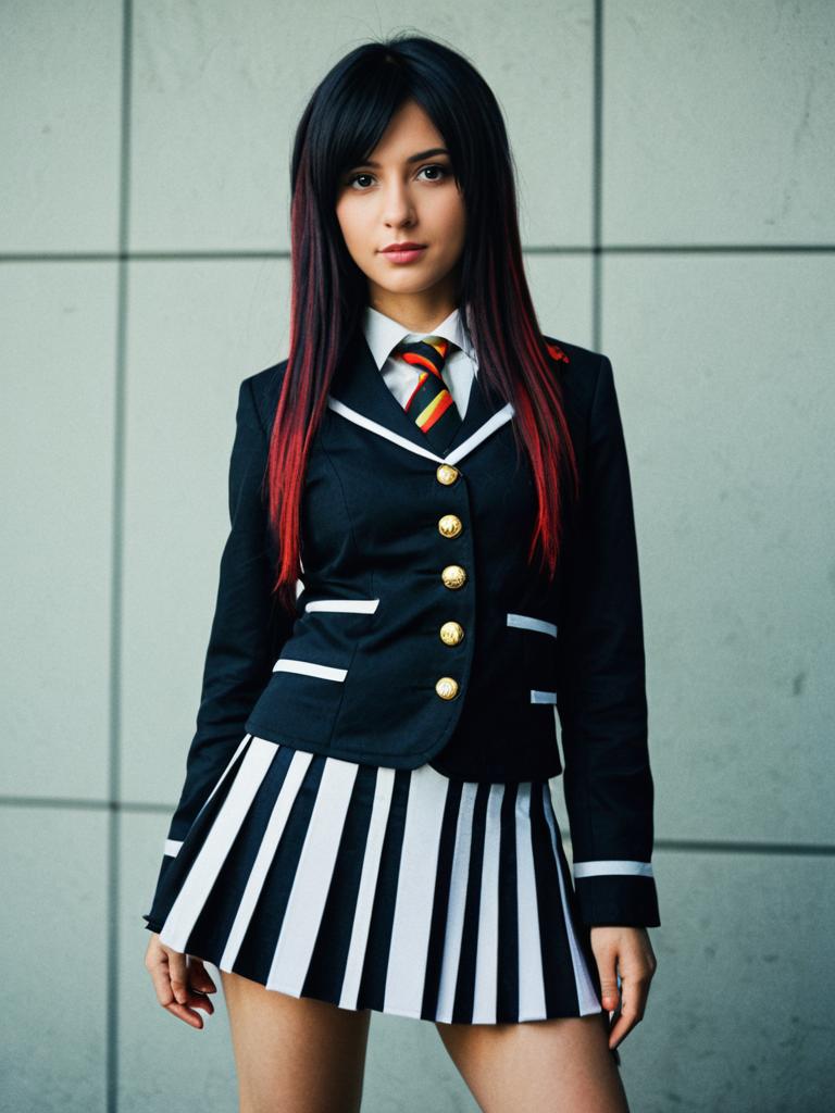 Woman in Mini Skirts costume, sharp textures, realistic cosplay headshot