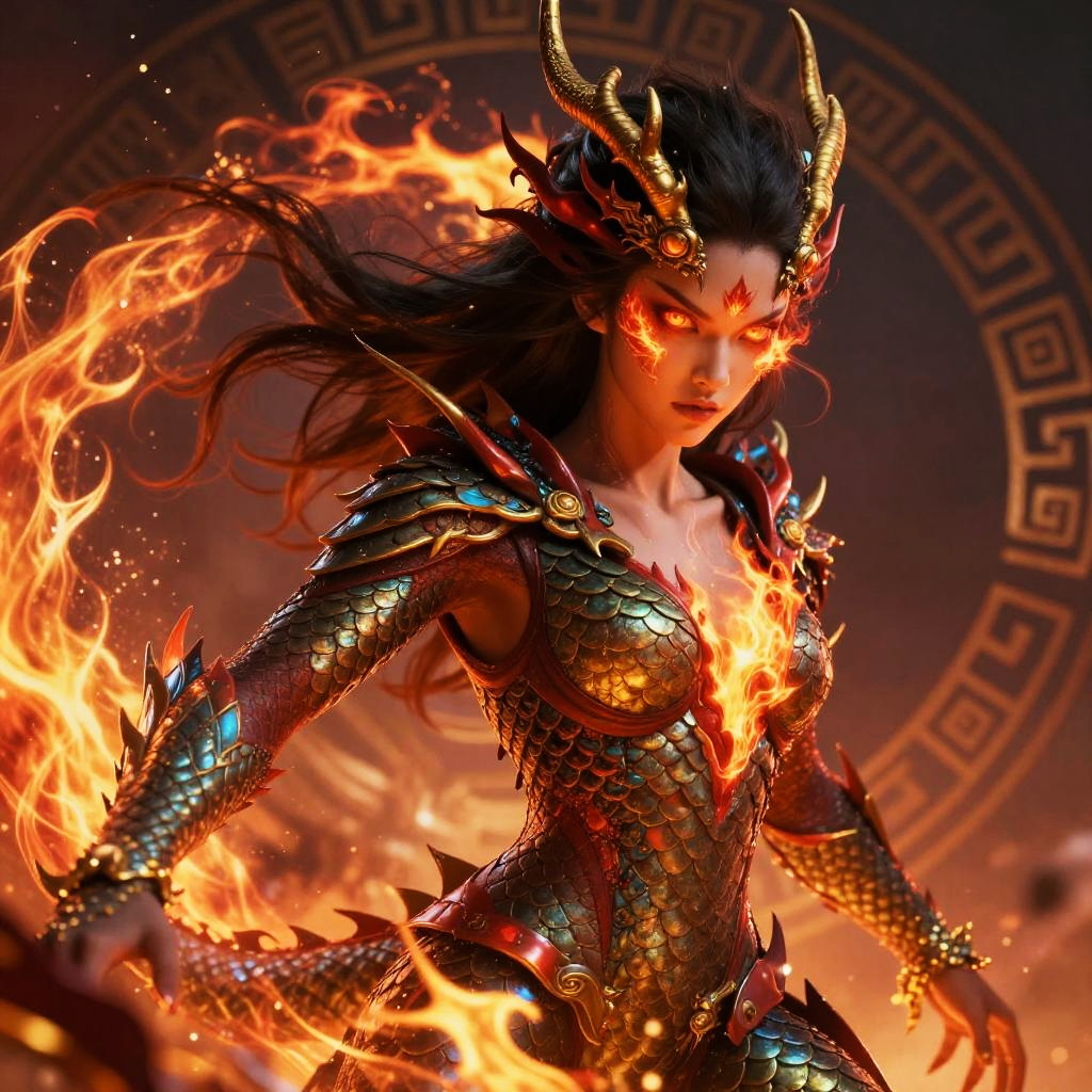 Digital artwork of a fierce, fiery demon woman with glowing red eyes, black hair, golden horns, and scale-covered armor, surrounded by flames. Background