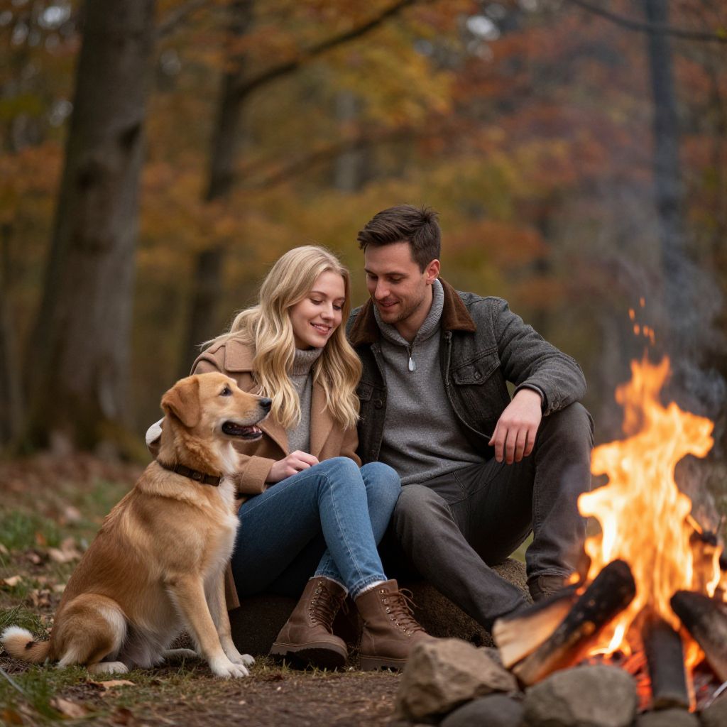 Young romantic couple sitting near a bonfire in an autumn forest. The woman has long blonde hair and is wearing a gray knitted sweater, jeans, and tan boots. The man has short dark hair and is dressed in a burgundy knitted sweater, jeans, and brown shoes. A small fluffy tan dog sits beside them on the leafy ground. The warm fire glows in the foreground with autumn trees and foliage in the background.