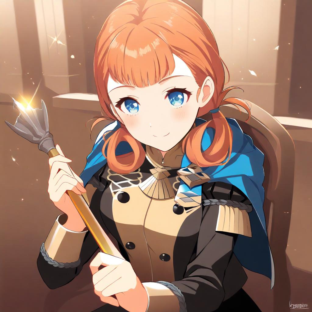 Digital anime-style image of a young girl with blue eyes and orange twin-tail hair wearing the Garreg Mach Monastery uniform from Fire Emblem. She is holding a staff with a glowing crystal tip, dressed in a dark and beige military-style outfit with a blue cape, seated in a softly lit environment. The artwork is detailed with a warm color palette.