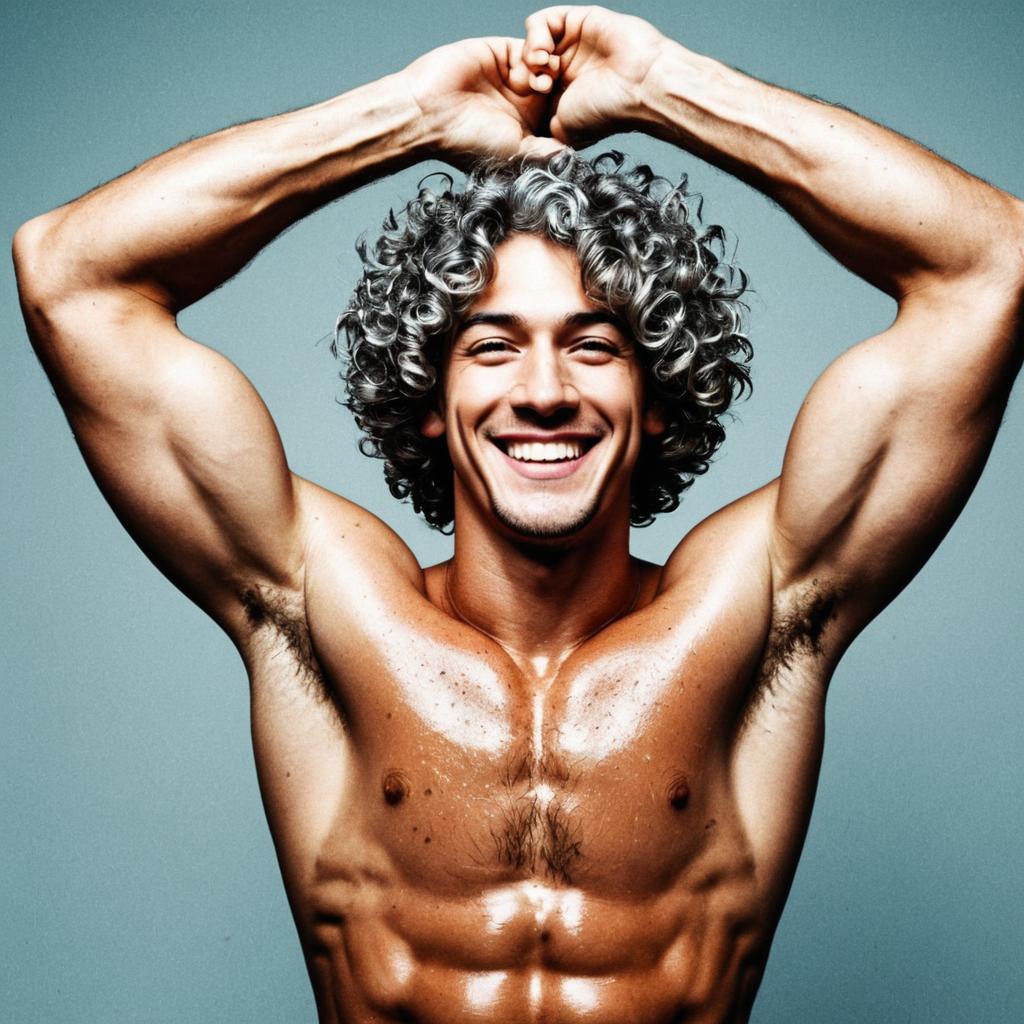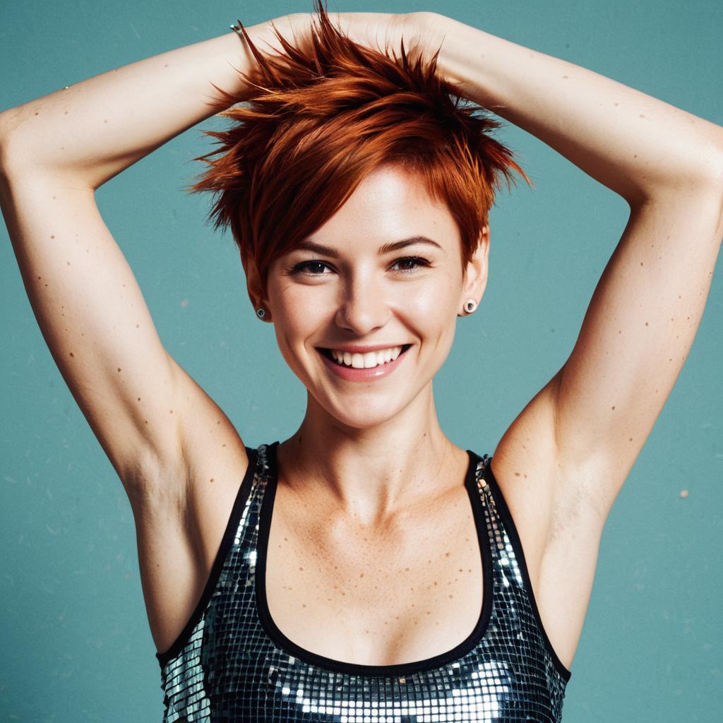 Portrait of a slim, muscular young man with spiky medium auburn hair, freckles, and a stud earring. He is smiling happily with his arms raised above his head, showing armpit hair and a sweaty torso. The background is a dark, tiled wall with small light reflections, evoking a modern, possibly disco-inspired atmosphere.