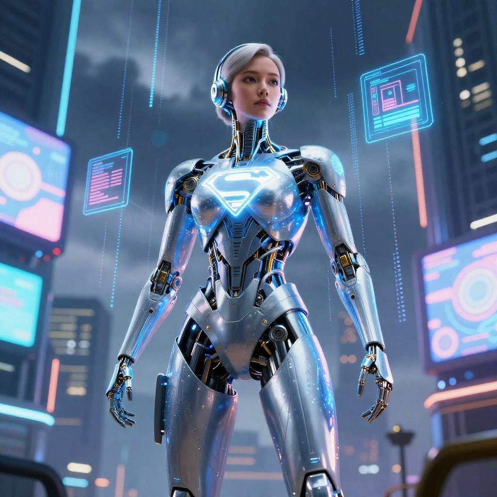Superhero AI depicted as an elegant fusion of human and machine, glowing blue and silver exoskeleton, surrounded by streams of data and floating holograms, futuristic urban environment with digital billboards and dark clouds, intense and futuristic atmosphere.