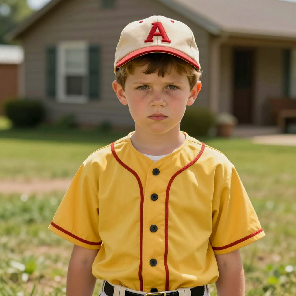 Stranger things eleven punk, photorealistic, young boy, standing on sunlit sidewalk, daytime, shallow depth of field, focused on boy, blurred background, brown hair, side-swept, serious expression, wearing red and white striped shirt, black vest, red belt, black pants, gloves, small white pocket square, summer afternoon, green grass and trees in background, slight wind in hair, realistic lighting, detailed ures, casual style, slightly formal, outdoor setting