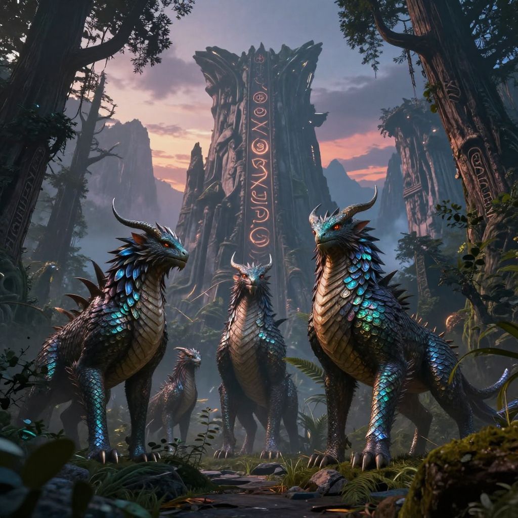 Mythic beasts emerging from ancient forests under a twilight sky, detailed scales and feathers shimmering, epic fantasy setting with towering mountains and glowing runes, highly detailed, cinematic lighting, concept art style