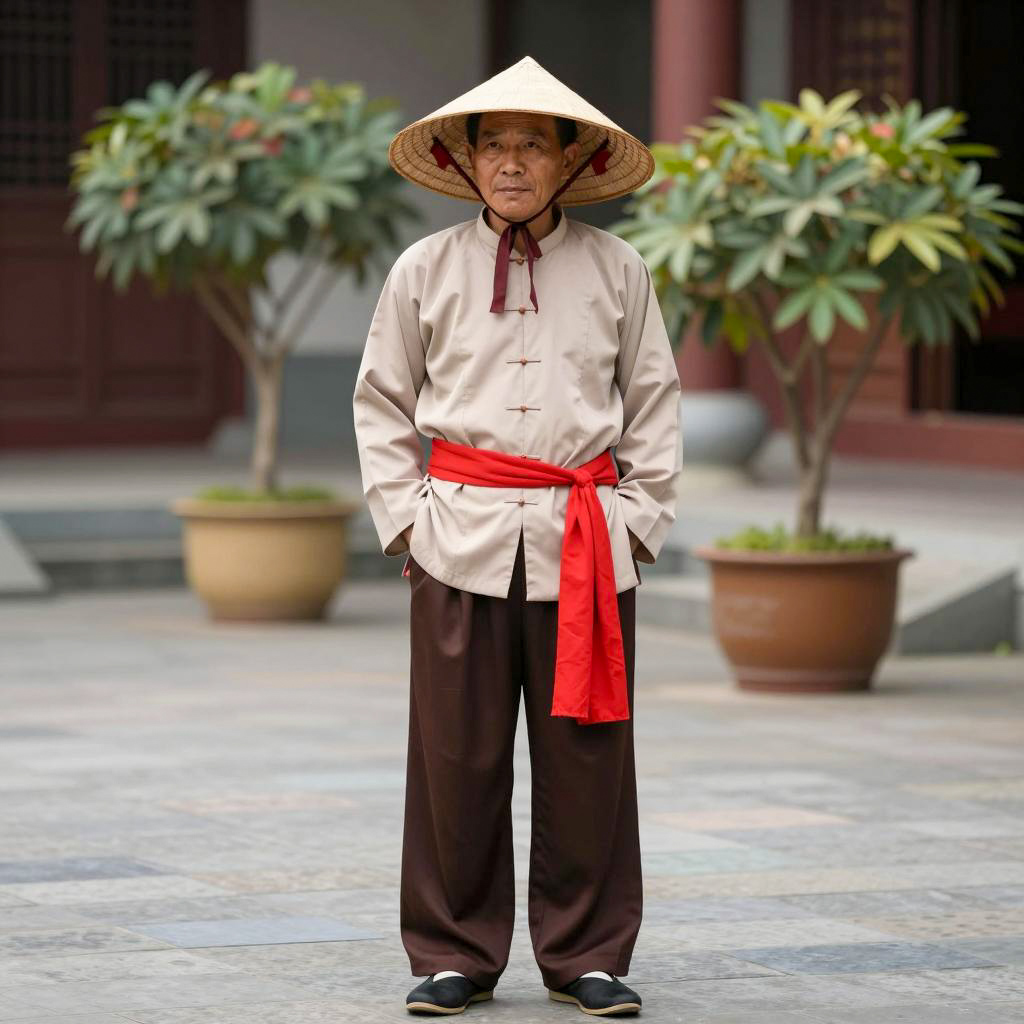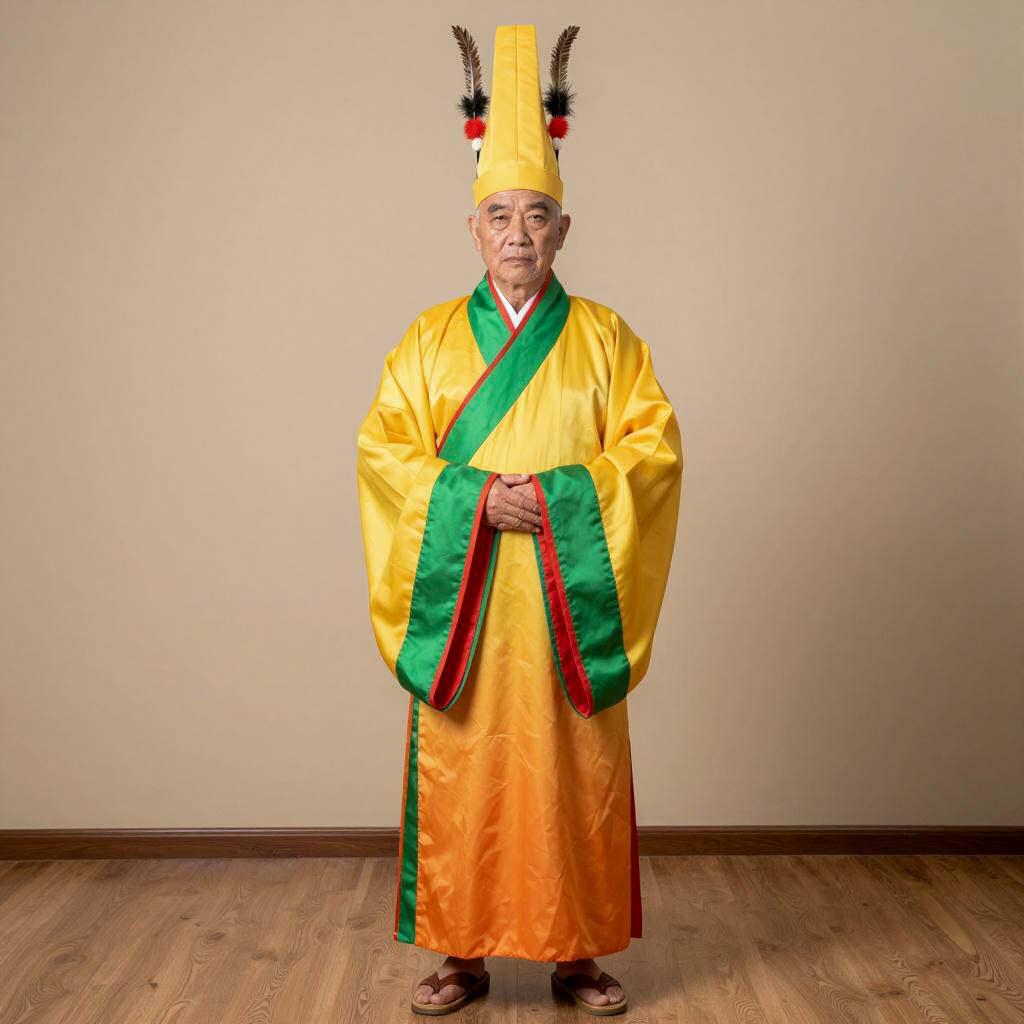 Raya costume, photograph of an elderly Asian man standing, full body, traditional yellow and orange robe with green and red trim, wide sleeves, tall cylindrical hat with feather, hands clasped, serious expression, brown sandals, plain beige background, soft natural light, neutral colors, cultural attire, standing on wooden floor, traditional costume, realistic, portrait, studio setting