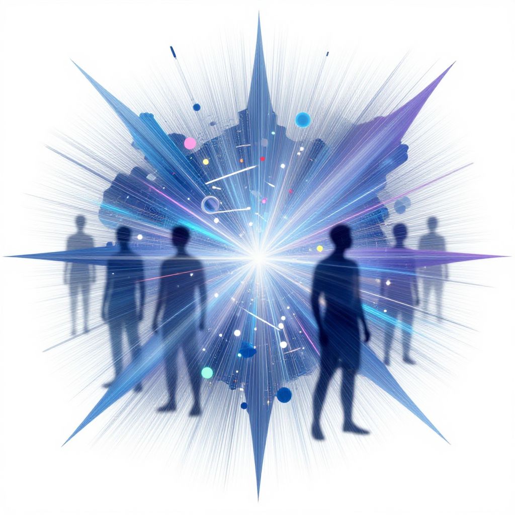 This digital artwork features a dynamic, radiant burst of blue, purple, and white colors at the center, surrounded by blurred silhouettes of five people standing in a semi-circle. The burst is composed of star-like shapes, lines, and circular elements, creating a sense of motion and energy. The people's silhouettes are dark blue, with indistinct features, and they are evenly spaced around the central burst. The background is white, making the vibrant colors and radiant burst stand out prominently. The overall style is abstract and futuristic, with a high contrast between the bright center and the dark silhouettes.