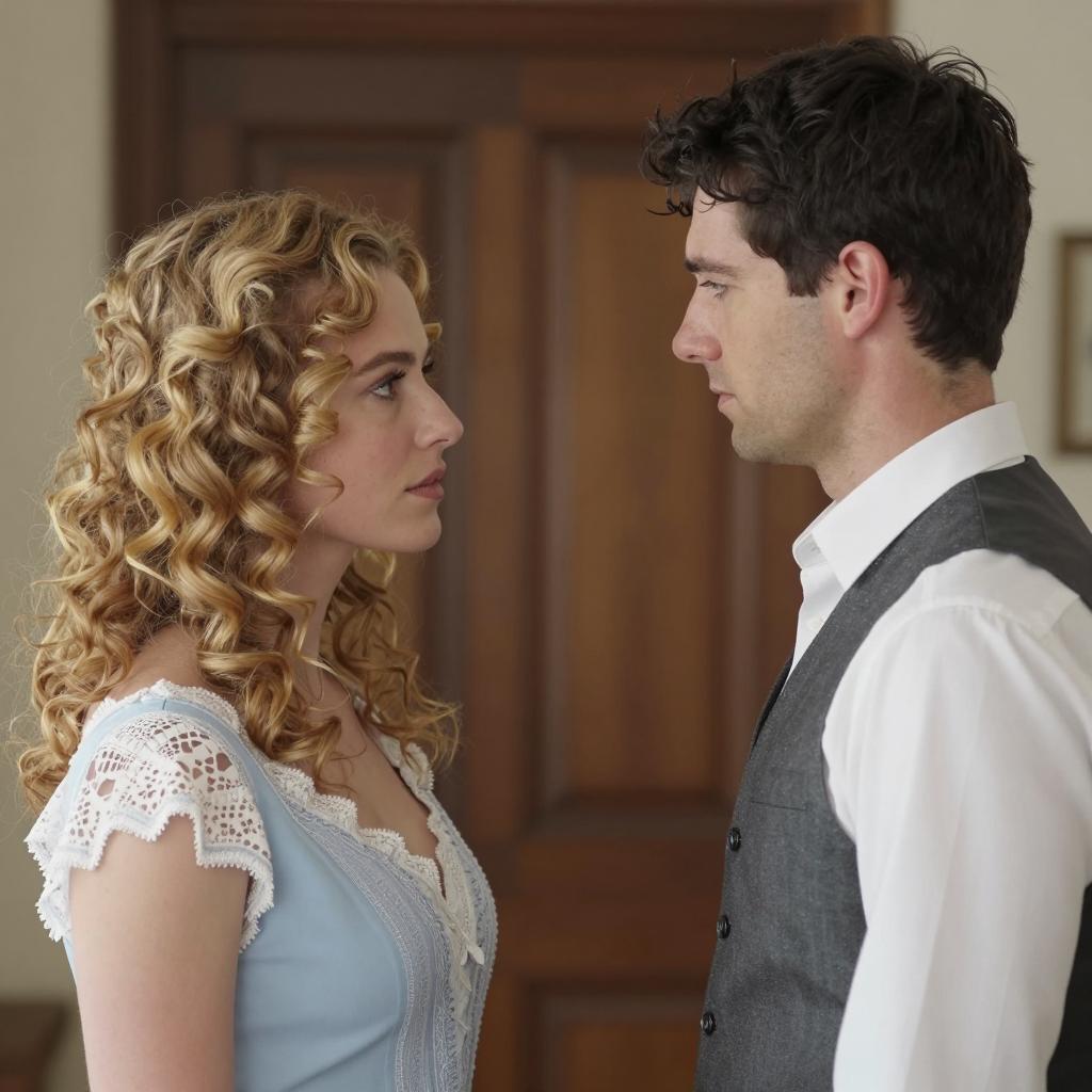 Photograph of two people in profile, facing each other. Woman with blonde, curly hair, wearing a light blue dress with white lace, looking to the right. Man with dark hair, wearing a white shirt and grey vest, looking at the woman. Background is blurred with wooden elements. Both have serious expressions.