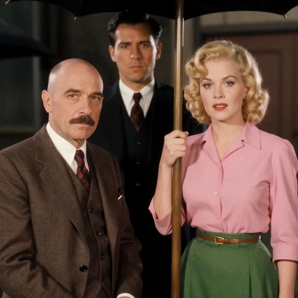 Photograph of a 1940s movie scene with four people. A woman in a green dress stands center, facing three men in dark suits and hats. One man, with glasses, stands close, while another looks down, and the third faces her. Background features a barred window. Bright yellow and orange at bottom right.