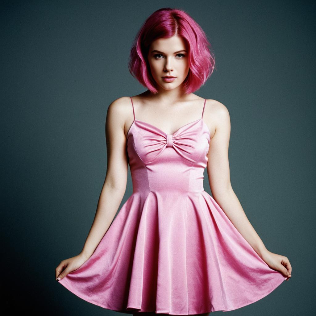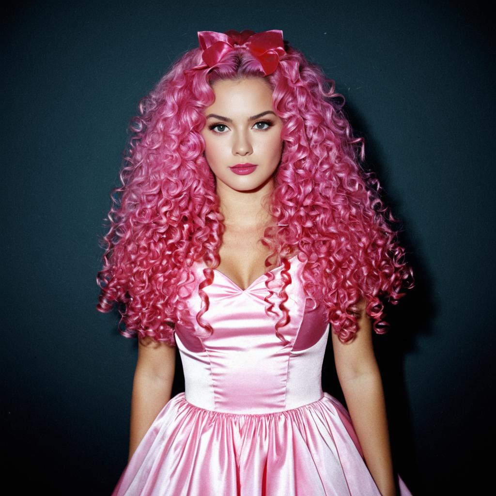 Portrait of a young woman with long, curly pink hair and a matching pink satin dress. She wears a large pink bow in her hair and has a natural makeup look with pink lipstick, standing against a dark background.