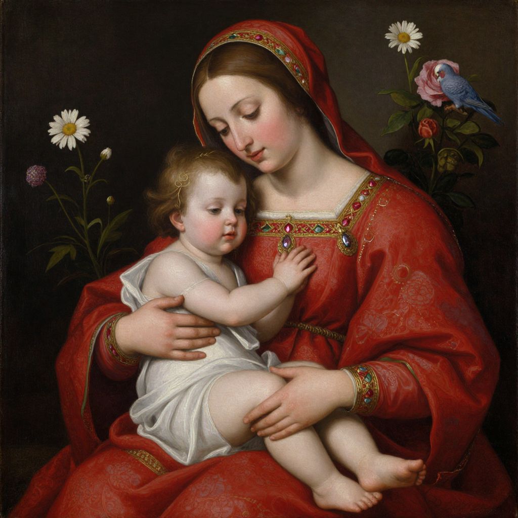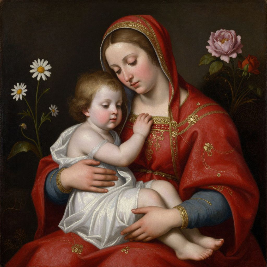 Gypsy Madonna, an oil painting by Paivi Eerola from Peony and Parakeet, seamlessly blends Renaissance influences with vibrant details, featuring a woman draped in a rich red robe adorned with intricate gold embellishments, cradling a child in a serene embrace, flanked by delicate floral elements including a daisy and a rose.