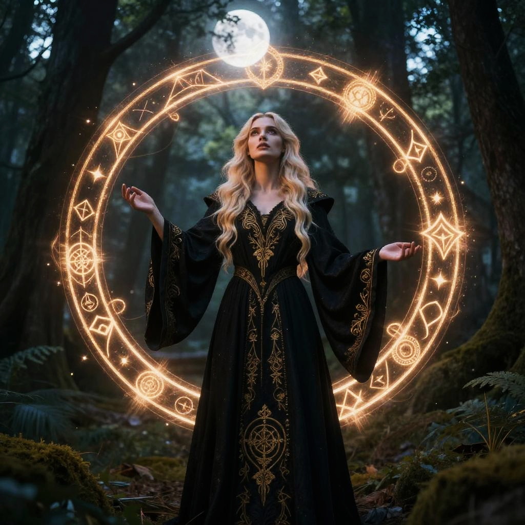 Witch with blonde hair standing in a mystical forest, glowing magical runes around her, wearing a dark robe with golden embroidery, moonlight filtering through the trees, fantasy style