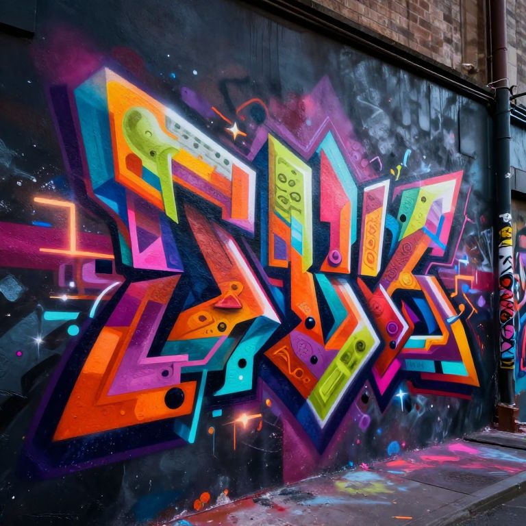 3d graffiti drawings featuring abstract geometric shapes emerging from the wall, vivid neon colors illuminating dark alley, hyper-realistic textures, intricate layering, urban street art environment with glowing accents and dramatic lighting
