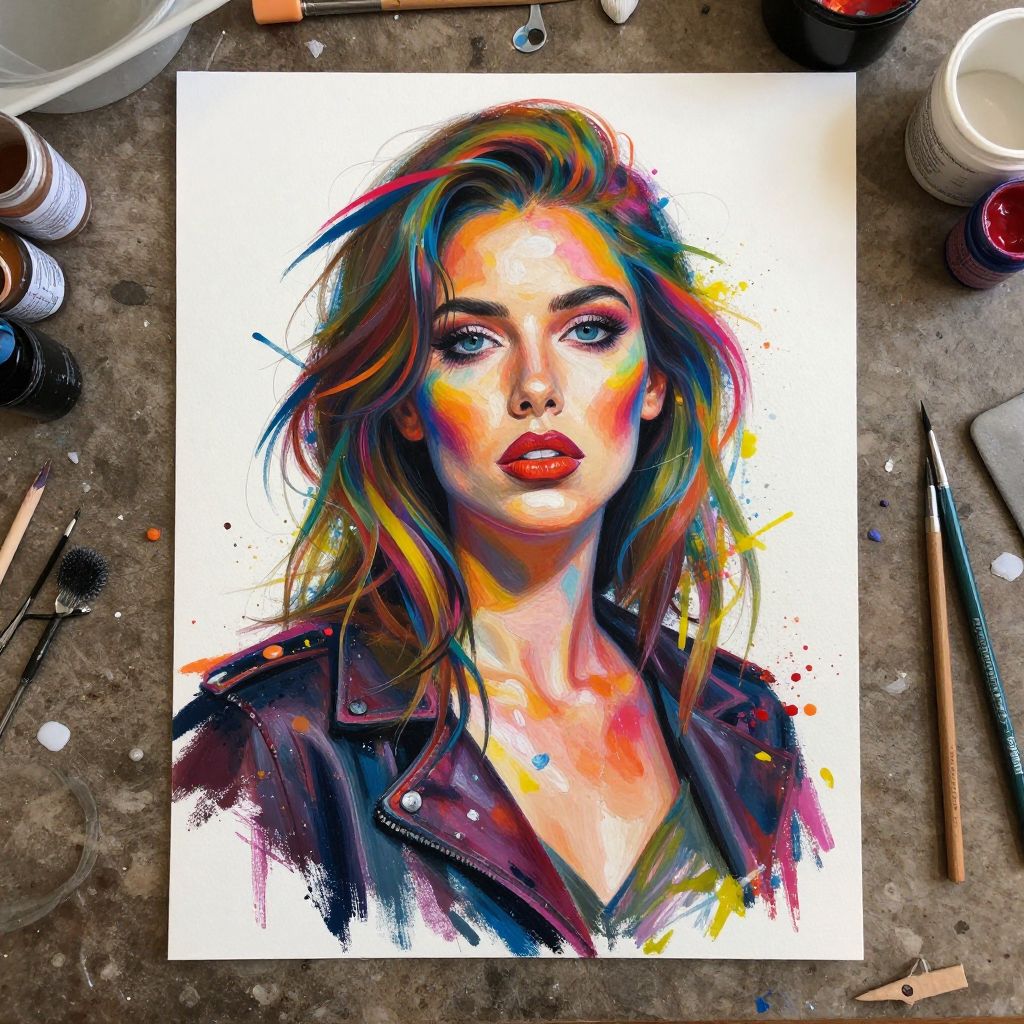Vividly colored digital portrait of a woman with rainbow hair, red lips, and black leather jacket on a painter's cluttered desk.