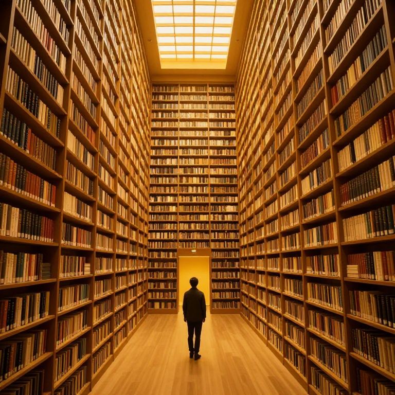 A solitary figure stands in the center of an expansive library, surrounded by towering shelves filled with countless books, illuminated by warm, golden lights that cascade down from the high ceiling, casting a serene glow over the vast, symmetrical space.