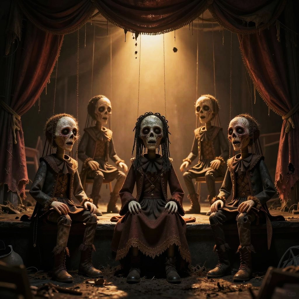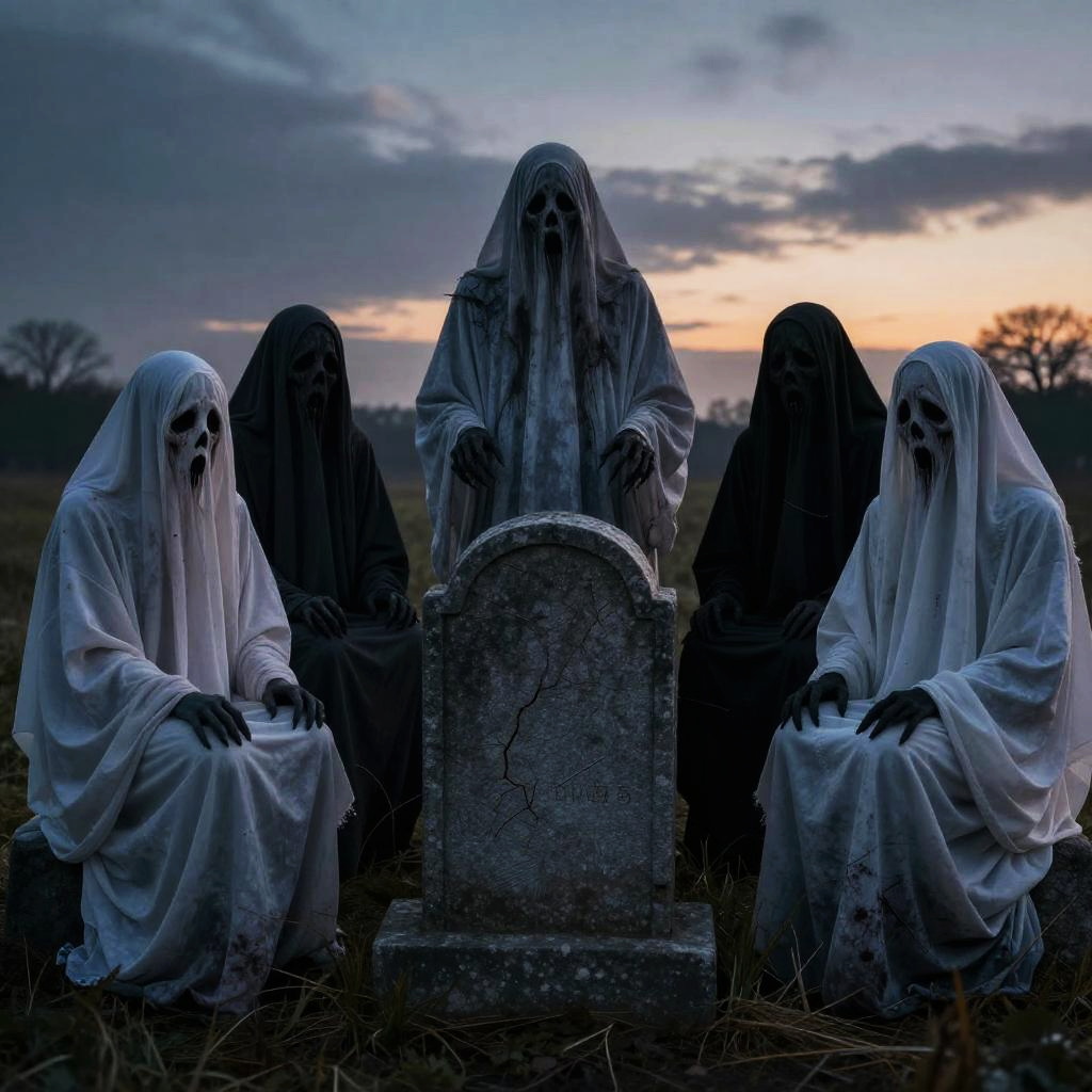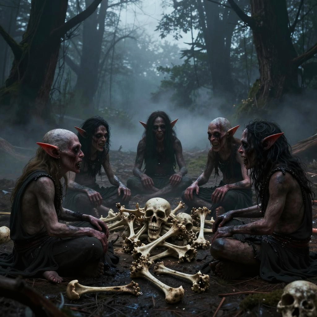 Five scary dreadful goblins sitting around a scattered bones, apocalyptic atmosphere, misty twilight mood, hyper-realistic, 8K resolution, cinematic lighting, eerie and detailed
