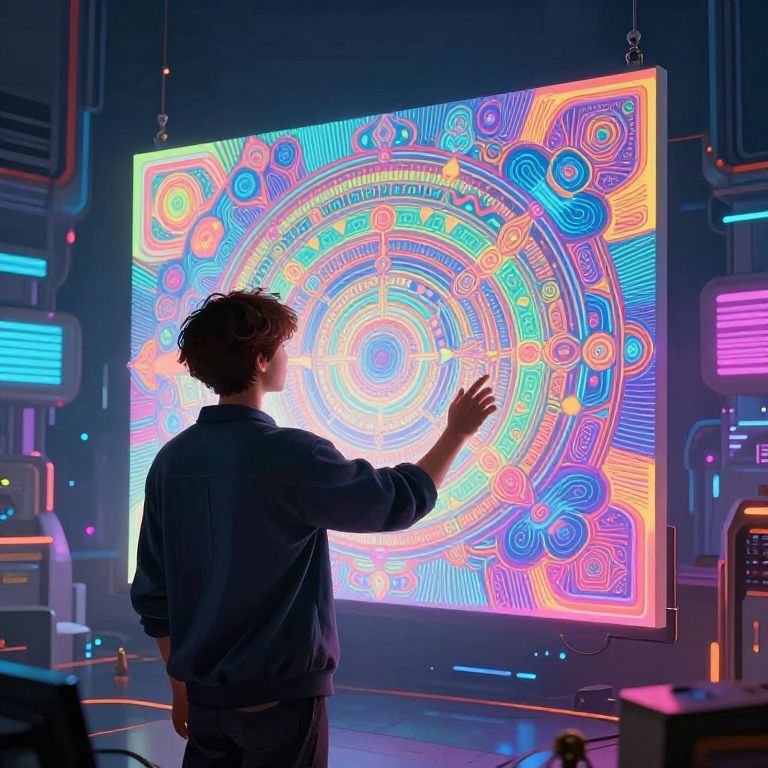 AI art is real art, a visionary depiction of a humanoid AI artist presenting a large, luminous canvas filled with complex patterns and vivid colors, surrounded by digital artifacts and futuristic architecture, capturing the evolving identity of creativity in the machine age.