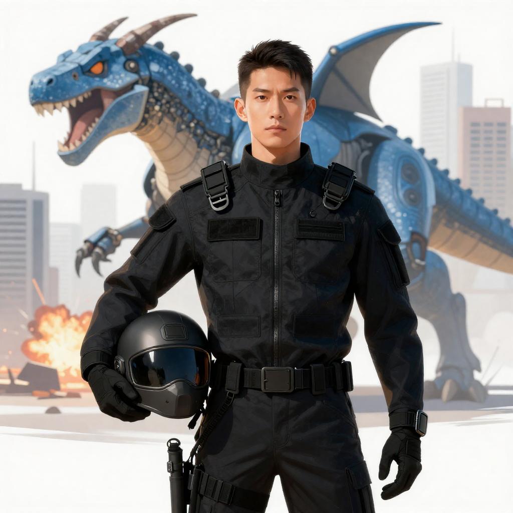 Digital illustration of an Asian man wearing a black tactical suit, standing confidently with a black helmet in hand. He is set against a cityscape background featuring tall buildings, explosions, and a large blue robotic dragon resembling a roaring dinosaur. The man has a neutral expression and is equipped with tactical gear including gloves, belt, and straps.