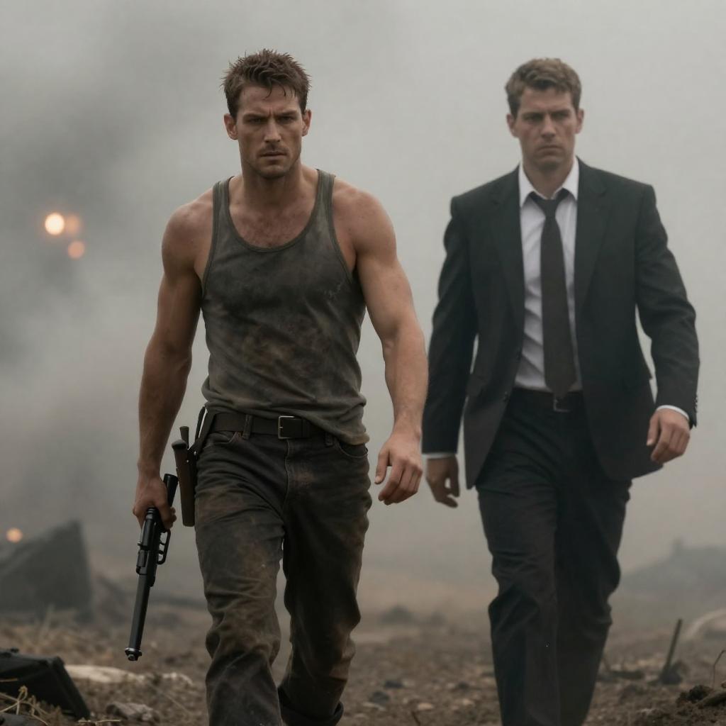 Photograph of a group of rugged men in a yellow-tinted cityscape. Central man with messy brown hair, intense gaze, scarred face, and fur-lined coat. Surrounding men in leather jackets, beanies, and winter clothing. Various expressions: serious, determined. Background: skyscrapers and yellow lighting.