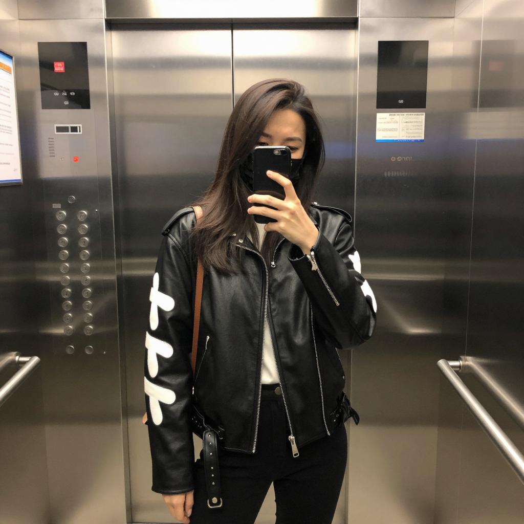 Woman taking selfie in mirror. Brown hair in high bun, wearing black sunglasses, blue fur coat. Holding black phone in right hand, left hand in hair. Large white candle in silver holder on left. Reflection shows white wall, metal shelves in background. Room lit by ceiling light. Grey-framed mirror on right. Woman's expression serious. One person.