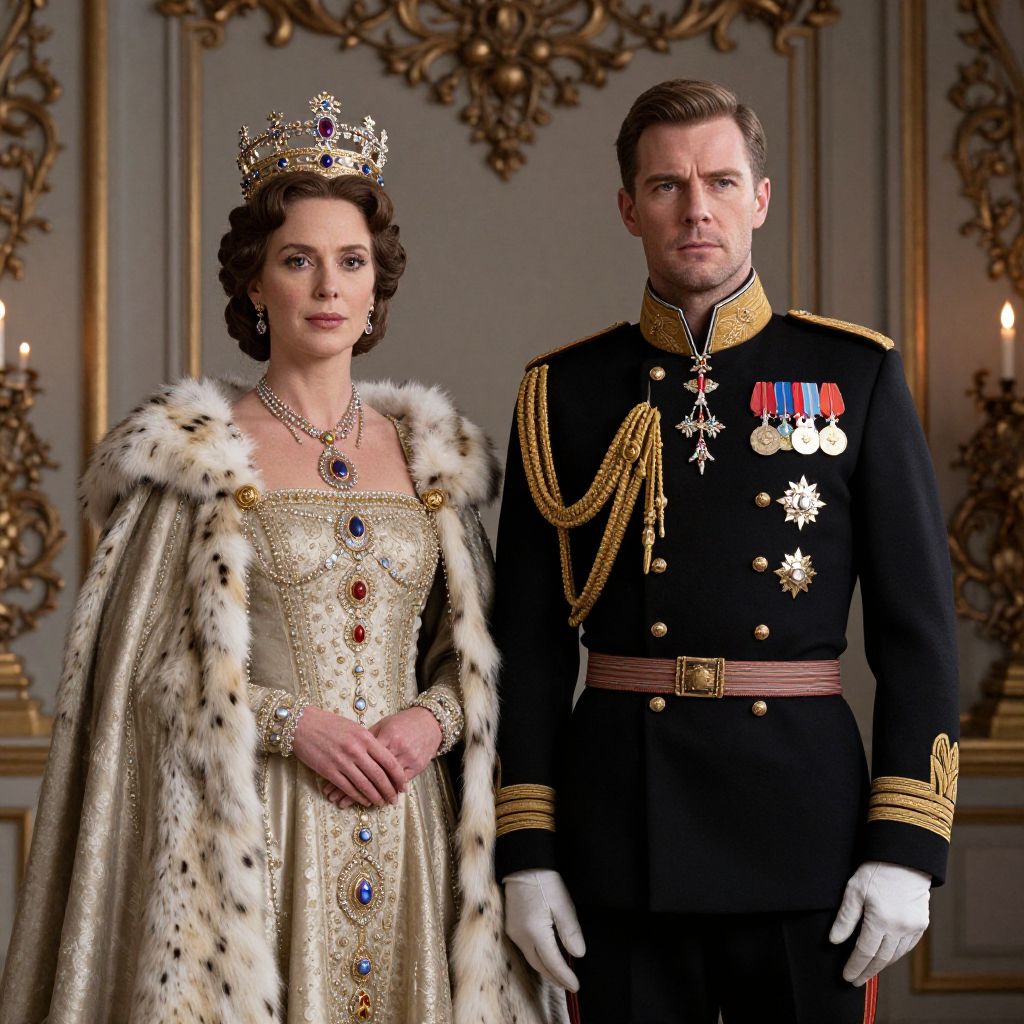 A regal couple dressed in luxurious king and queen costumes stands confidently against an ornate backdrop, showcasing cinematic realism with dramatic and refined detailing. The woman wears a crown and an elegant gown adorned with jewels and fur, while the man is in a dark military-style uniform decorated with medals and gold accents, embodying royalty and grandeur.