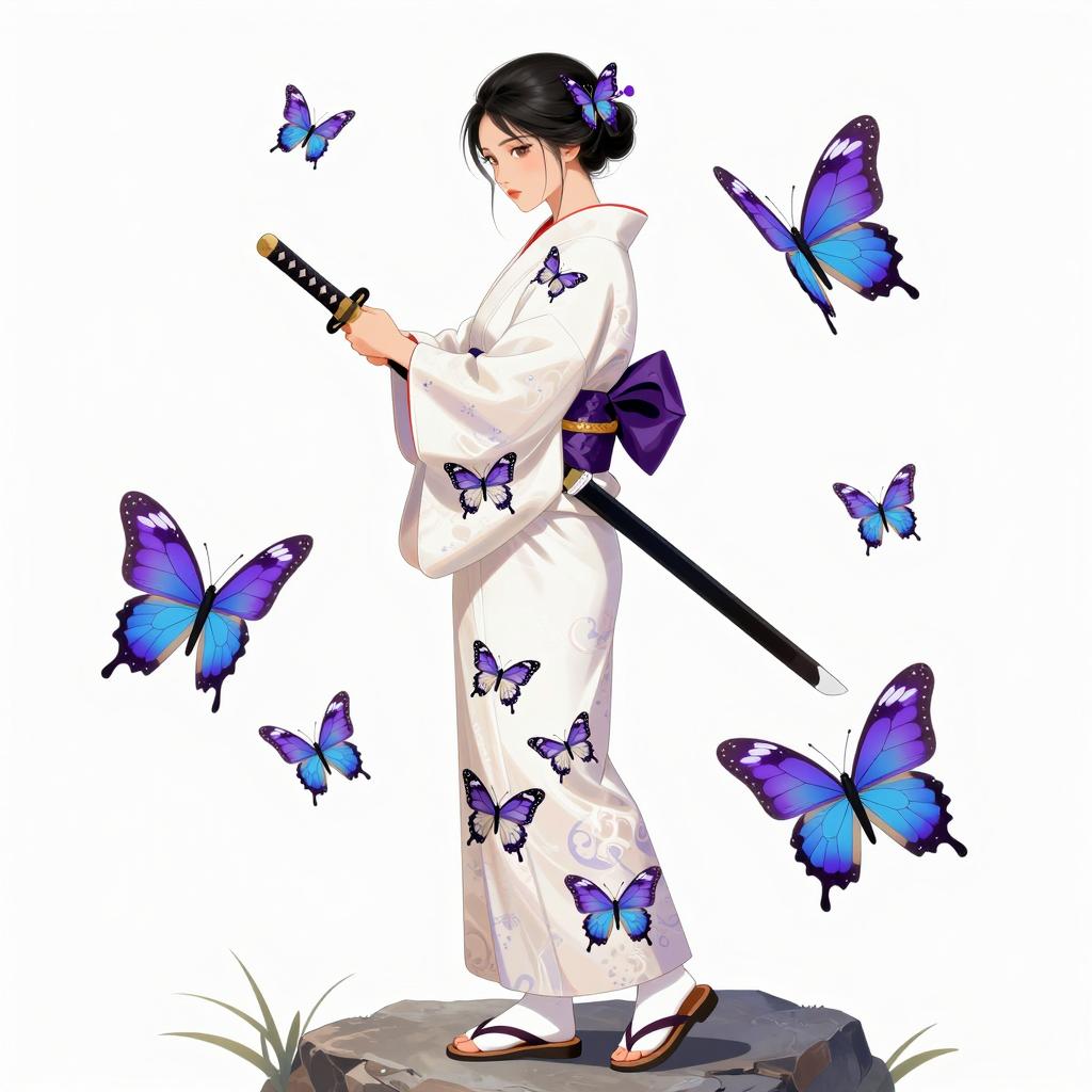 Digital illustration of an East Asian woman with pale skin, black hair in a bun with a pink butterfly hairpin, wearing a black floral kimono. She holds a katana with a purple and gold handle. Two butterflies fly around her. She looks to the side with a calm expression. Dark background.