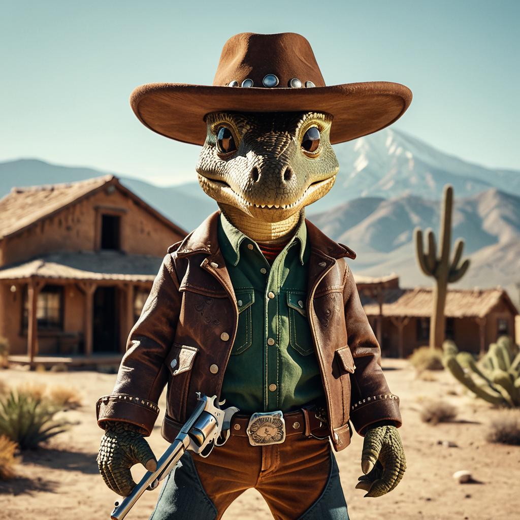 A photorealistic cute dinosaur character dressed as a cowboy, wearing a large brown hat and leather jacket, holding a shiny silver revolver, standing in a sunlit desert with a rustic adobe building and mountains blurred in the background, cinematic lighting highlighting detailed textures of scales and fabric, warm brown and green color tones, soft focus on background