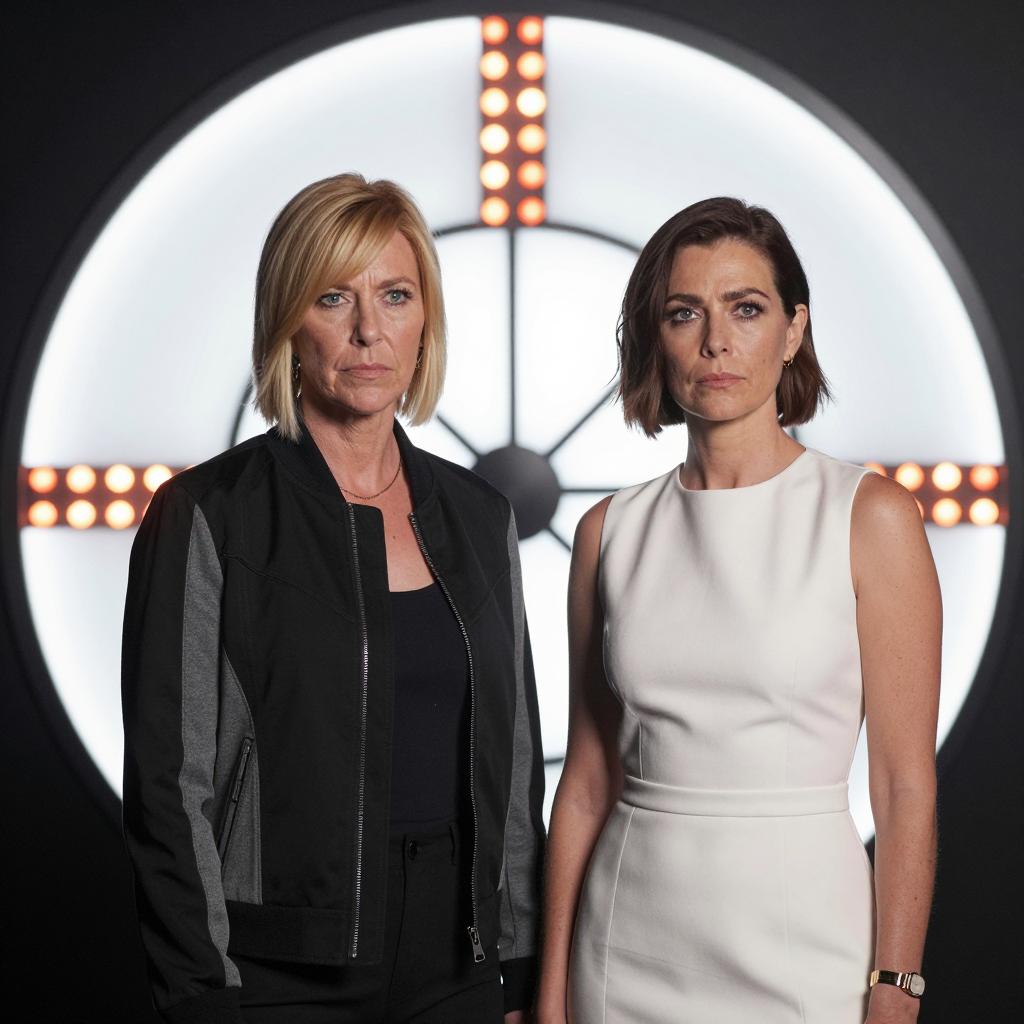 Four women standing in an indoor setting. First woman: green blazer, white shirt, red skirt, fair skin, brown hair. Second woman: plaid blazer, white shirt, red skirt, fair skin, blonde hair. Third woman: yellow blazer, white shirt, blonde hair. Fourth woman: black blazer with white pattern, white blouse, black hair. All women have serious expressions. Background: beige walls, teal door frame. Women stand close together, facing forward.