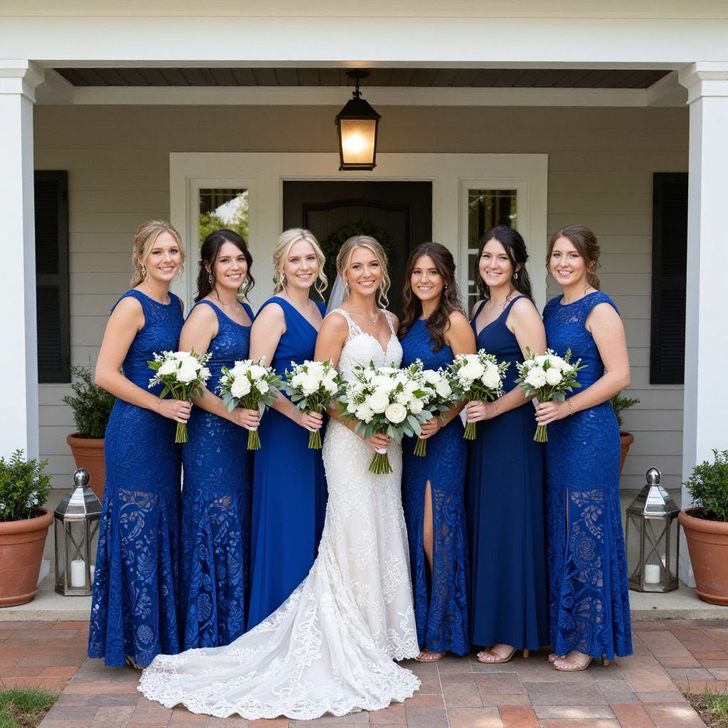 Five groomsmen in navy blue suits with white roses, sitting on a stone ledge, smiling at each other, in front of a grand, ne
