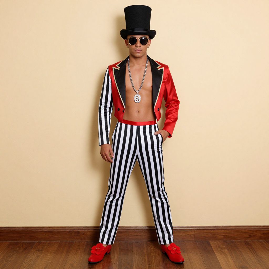 Photograph of a young man standing against a beige wall with a wooden floor. He is wearing a black top hat, round black sunglasses, a red satin jacket with black and white striped lapels, and black and white vertically striped pants. His chest is bare, showcasing a fit, medium build. He has a silver pendant on a black cord around his neck. His red, shiny, lace-up shoes match his jacket. The man's confident stance and direct gaze at the camera convey a bold, stylish presence.