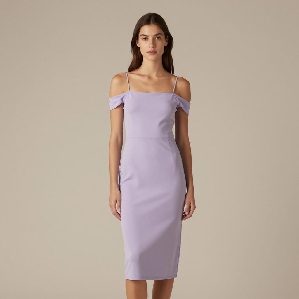 Female pleated trapeze midi, photorealistic, full-body shot, young woman, long wavy brown hair, fair skin, standing, neutral expression, sleeveless beige pleated dress, knee-length, fitted waist, loose skirt, black high-heeled sandals, studio background, soft gradient beige and pink wall, subtle lighting, fashion photography style, elegant, minimalist, model centered, no accessories, calm and poised atmosphere