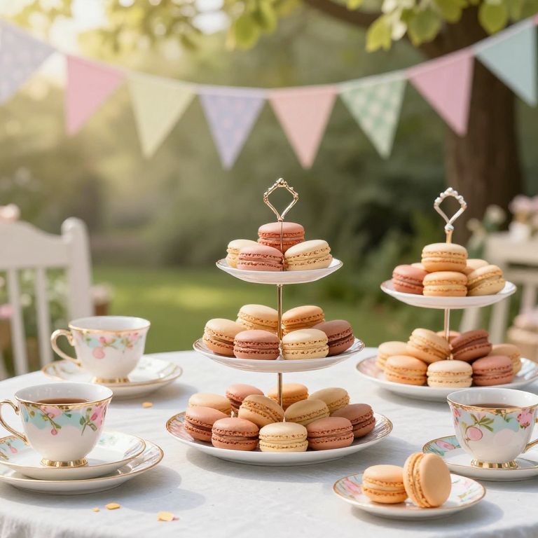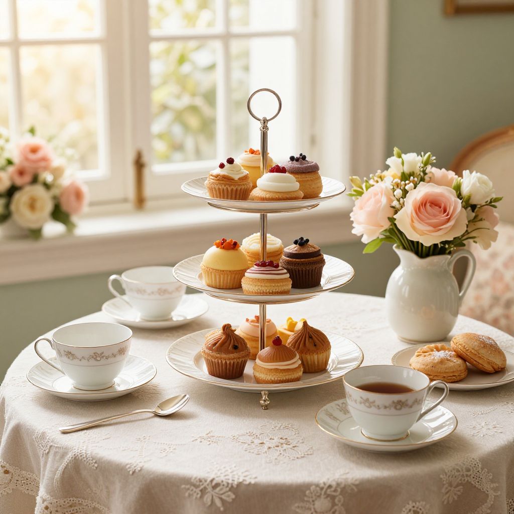 Vintage tea setting with three-tiered cupcake stand, floral vase, white china, tea cups, and pastries on lace-covered table, sunlight streaming