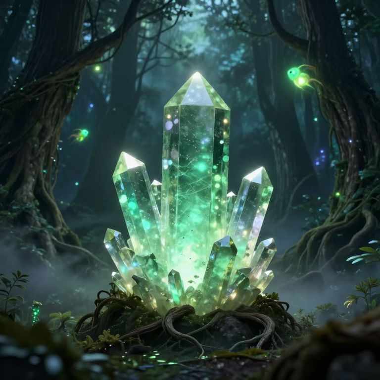 This digital fantasy artwork depicts a glowing, crystal cluster emerging from a dark forest floor. The crystals, in varying sizes, radiate vivid green and blue light, illuminating the surrounding mist and foliage. The central crystal is tall and pointed, flanked by larger, angular crystals. Ethereal green fireflies hover around, enhancing the mystical ambiance. The background features tall, shadowy trees with gnarled roots. The image exudes a magical, otherworldly atmosphere, with the crystal cluster as the focal point, showcasing intricate details and a luminous, enchanting glow.