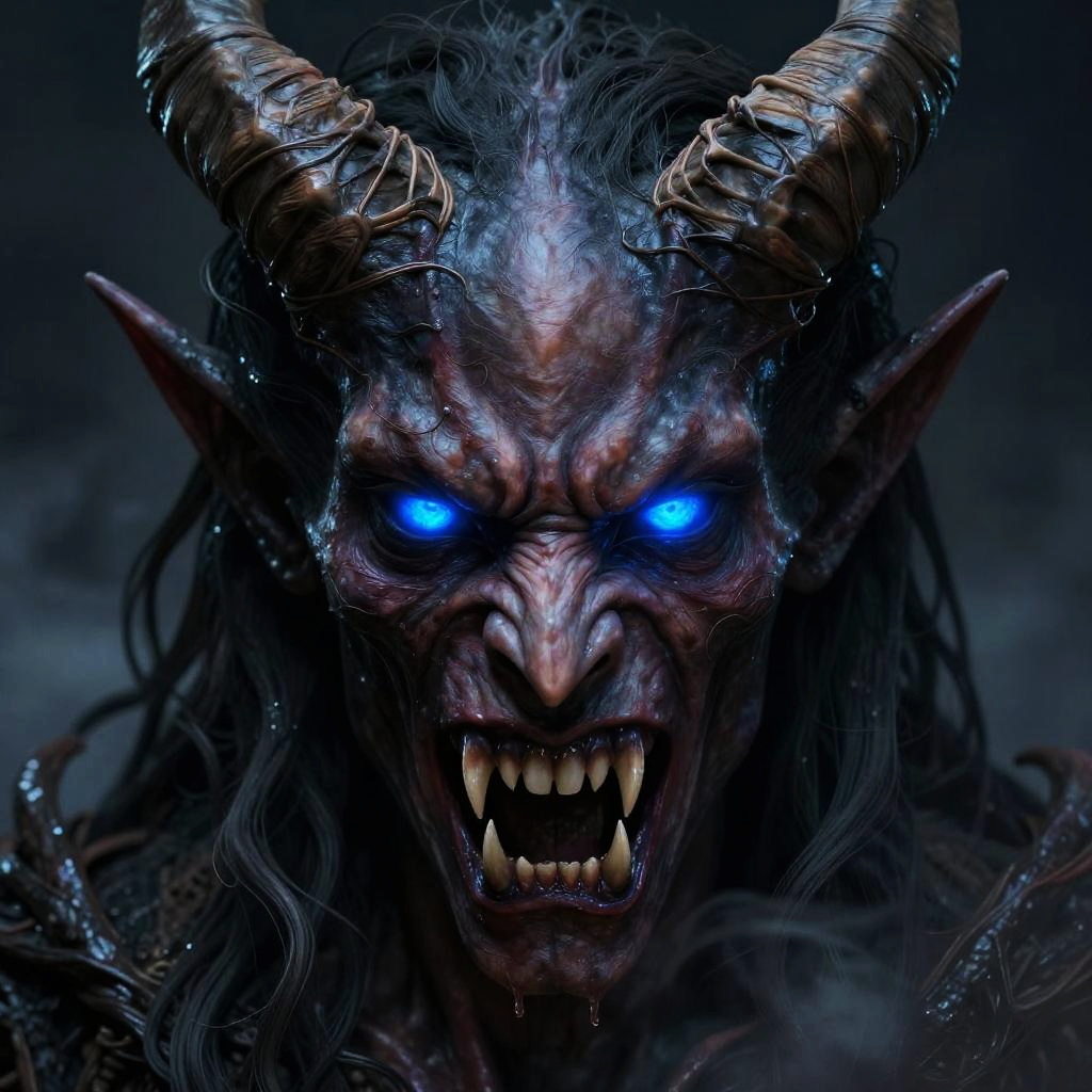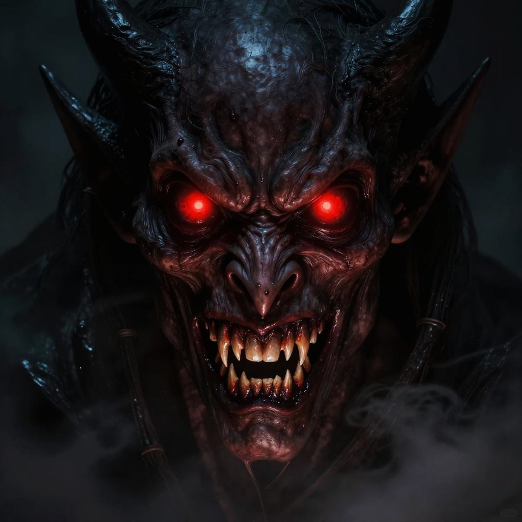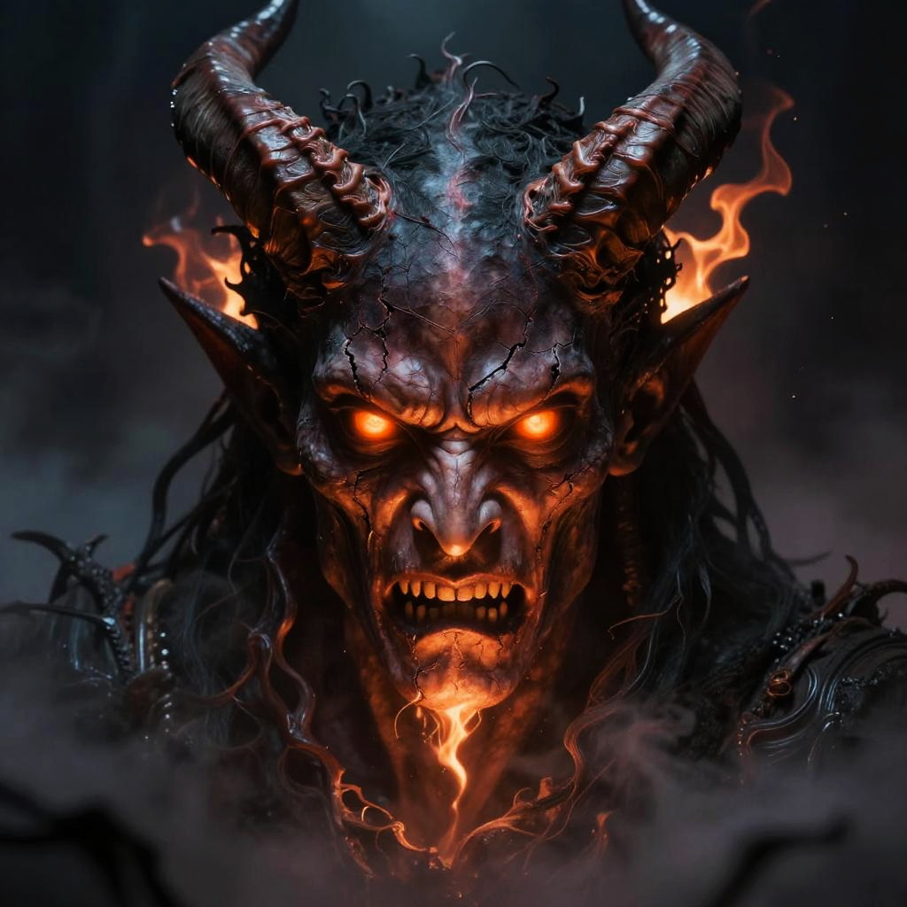 Sinister demon face with smoldering molten skin, sharp teeth bared in a grimace, glowing ember eyes, surrounded by swirling black smoke, dark fantasy dark art style